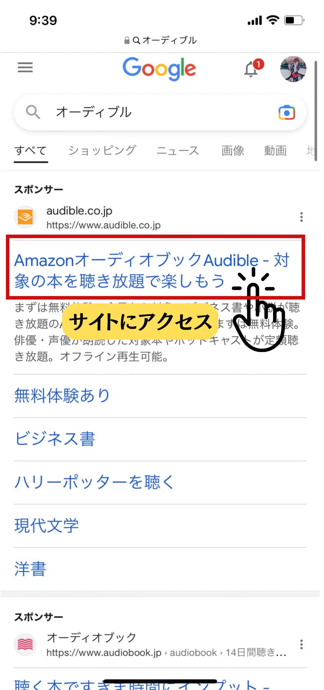 「Google」「サファリ」等で「オーディブル」を検索し、Webサイトにアクセス!